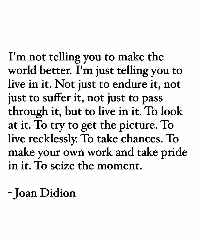 Joan Didion Quotes Quotable Quote. Im not telling you to make the world better because I dont think that progress is necessarily. Not just to endure it not just to suffer it not just to pass through it but to live in it.